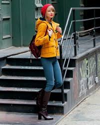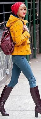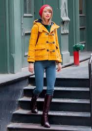 Taylor Swift Style Yellow Coat With Jeans Boots Red Hat And Red Lips Taylor Swift Street Style Taylor Swift Style Taylor Swift New